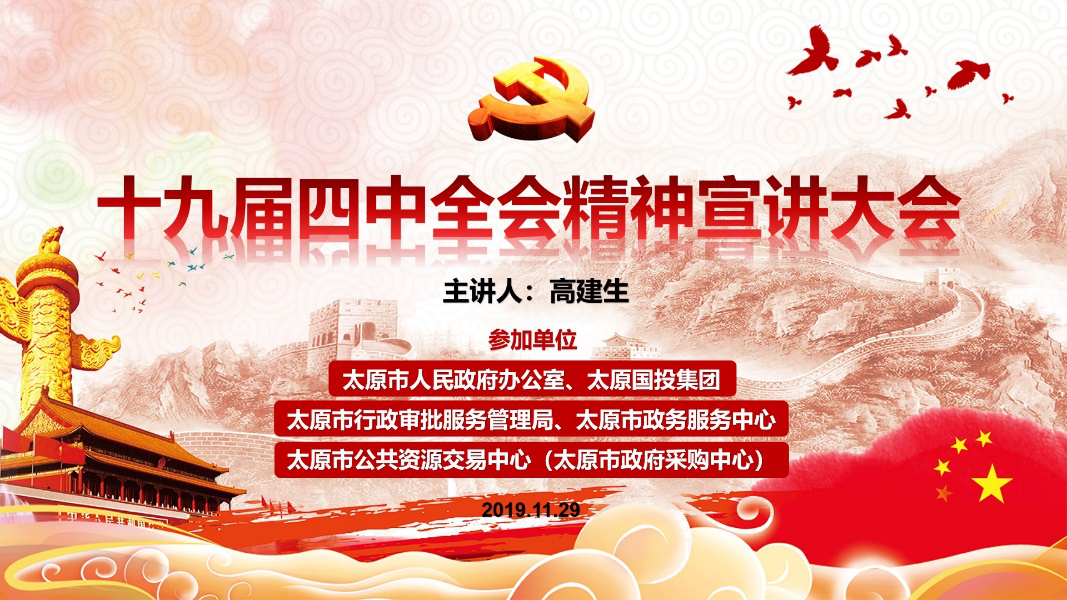 11月29日下午,為深入學習貫徹黨的十九屆四中全會精神,公司特邀山西省社會科學聯(lián)合會副主席,省政協(xié)文史與學習委員會副主任,教授,博士生導師、享受國務院特殊津貼專家、省委聯(lián)系的高級專家,省委黨校原副校長、巡視員高建生教授在太原市為民服務中心六樓會議室為來自太原市人民政府辦公室、太原國投集團、太原市行政審批服務管理局、太原市政務服務中心、太原市公共資源交易中心(太原市政府采購中心)的200余人,對黨的十九屆四中全會精神進行了宣講。
