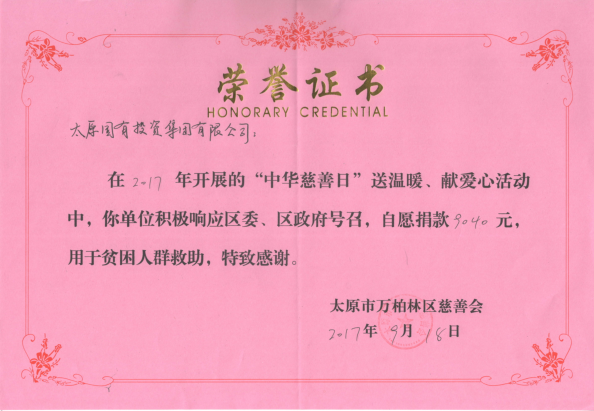 樂善好施、扶貧幫困是中華民族的傳統(tǒng)美德;奉獻(xiàn)社會(huì)、傳遞愛心是社會(huì)倡導(dǎo)的時(shí)代新風(fēng)。為培育和弘揚(yáng)社會(huì)主義核心價(jià)值觀,廣泛動(dòng)員員工參與慈善、奉獻(xiàn)愛心,形成團(tuán)結(jié)互助、扶貧濟(jì)困的良好風(fēng)尚,積極參與公民道德宣傳日活動(dòng)。9月14日,太原國(guó)投集團(tuán)組織開展了“中華慈善日”送溫暖、獻(xiàn)愛心捐款活動(dòng),共募集善款9040元整。