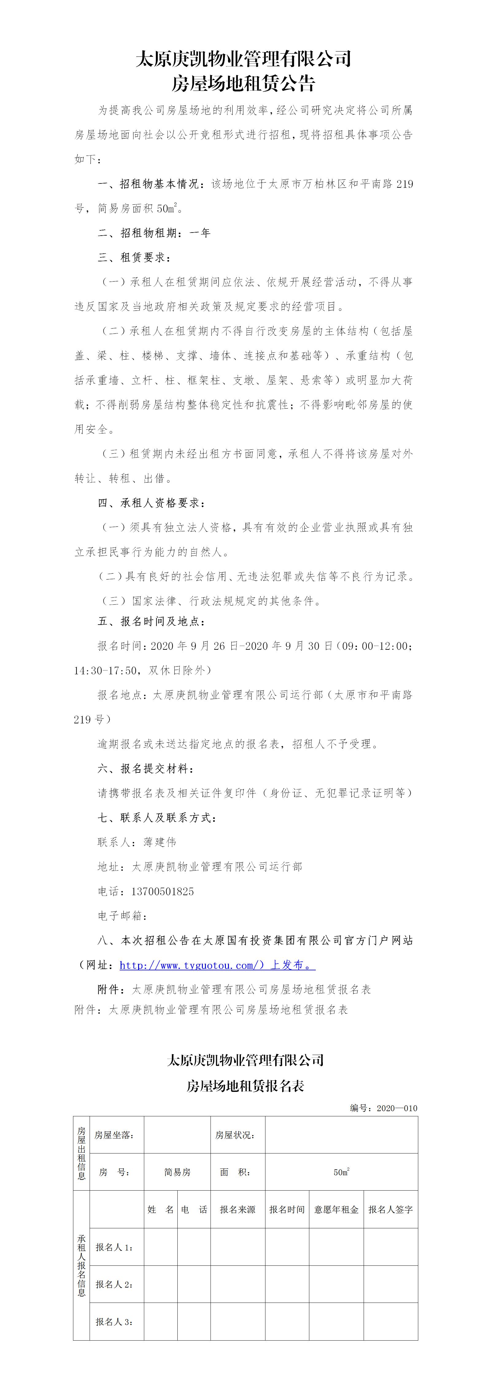 太原庚凱物業(yè)管理有限公司房屋場地租賃公告(十)