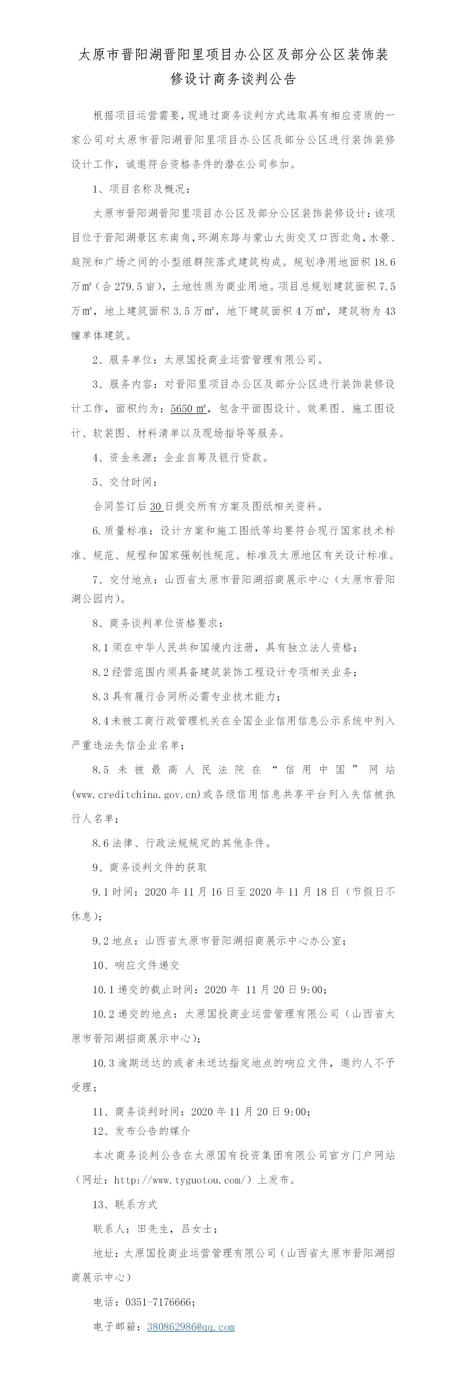 太原市晉陽湖晉陽里項目辦公區(qū)及部分公區(qū)裝飾裝修設計商務談判公告