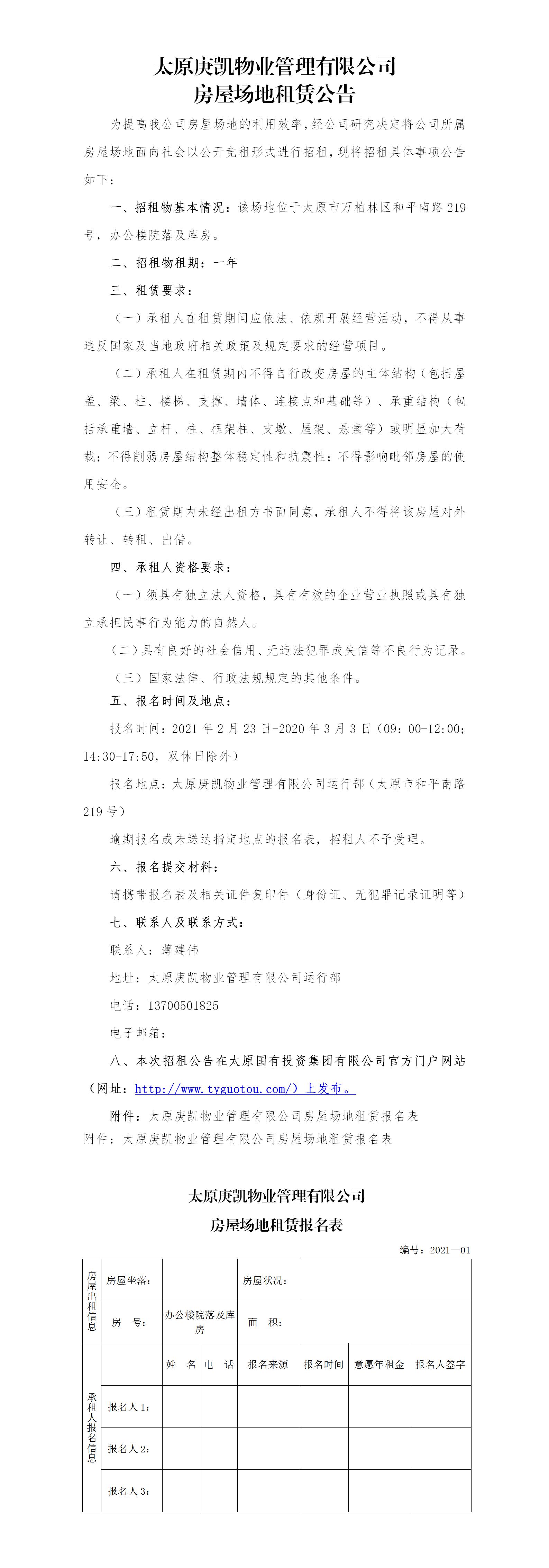 太原庚凱物業(yè)管理有限公司房屋場(chǎng)地租賃公告(二十二)