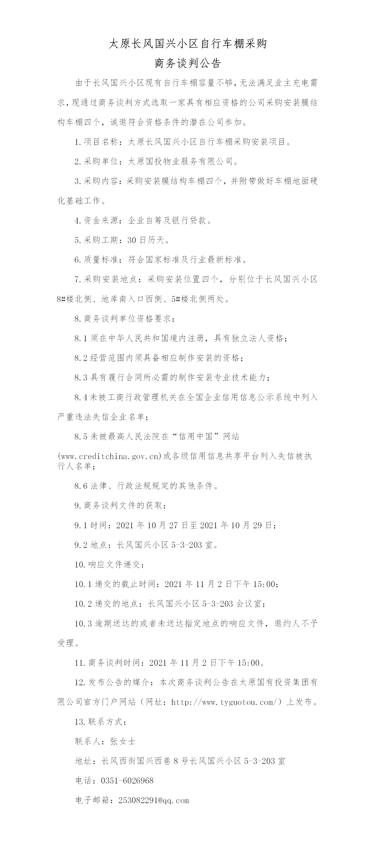 太原長風(fēng)國興小區(qū)自行車棚采購商務(wù)談判公告