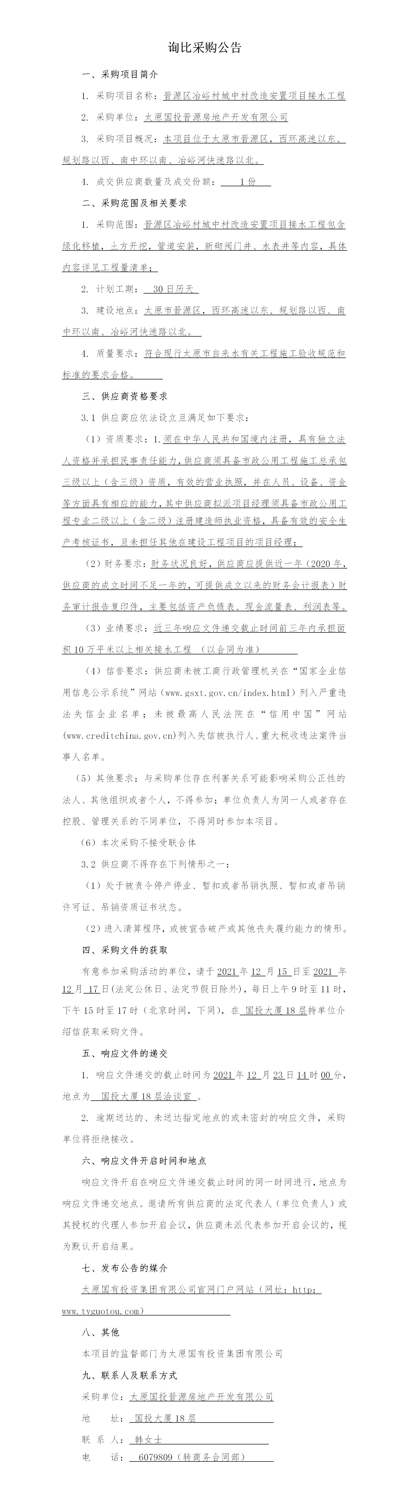 冶峪村城中村改造安置項(xiàng)目接水工程項(xiàng)目詢比公告