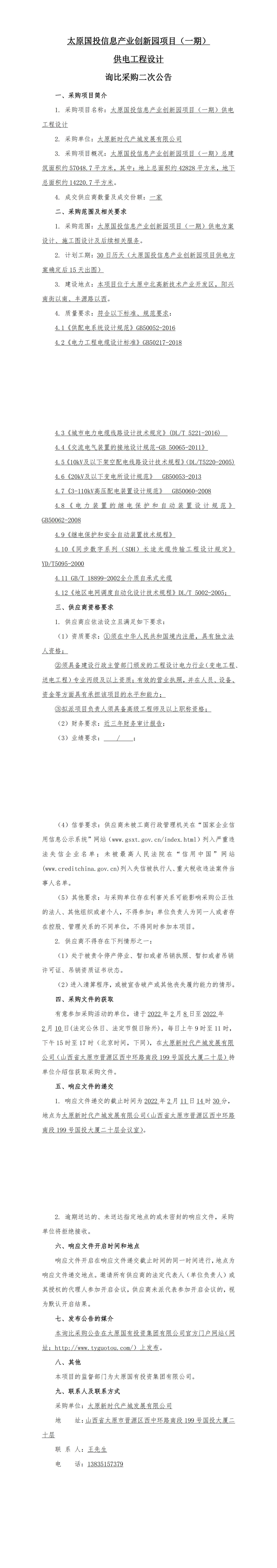 太原國投信息產(chǎn)業(yè)創(chuàng)新園項目(一期)供電工程設(shè)計詢比采購二次公告