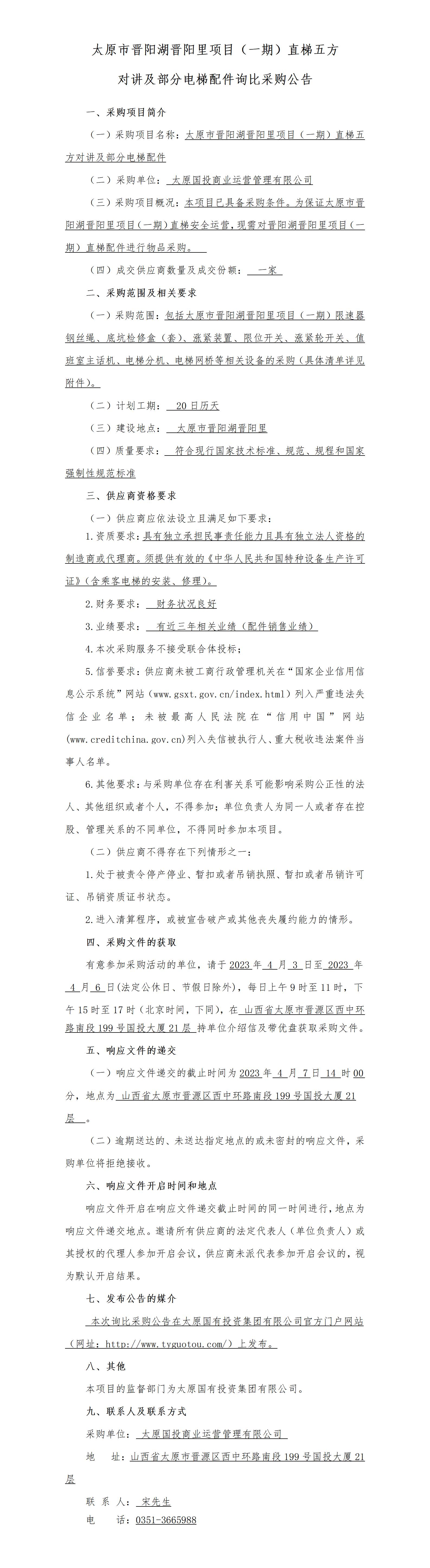 太原市晉陽湖晉陽里項目(一期)直梯五方對講及部分電梯配件詢比采購公告