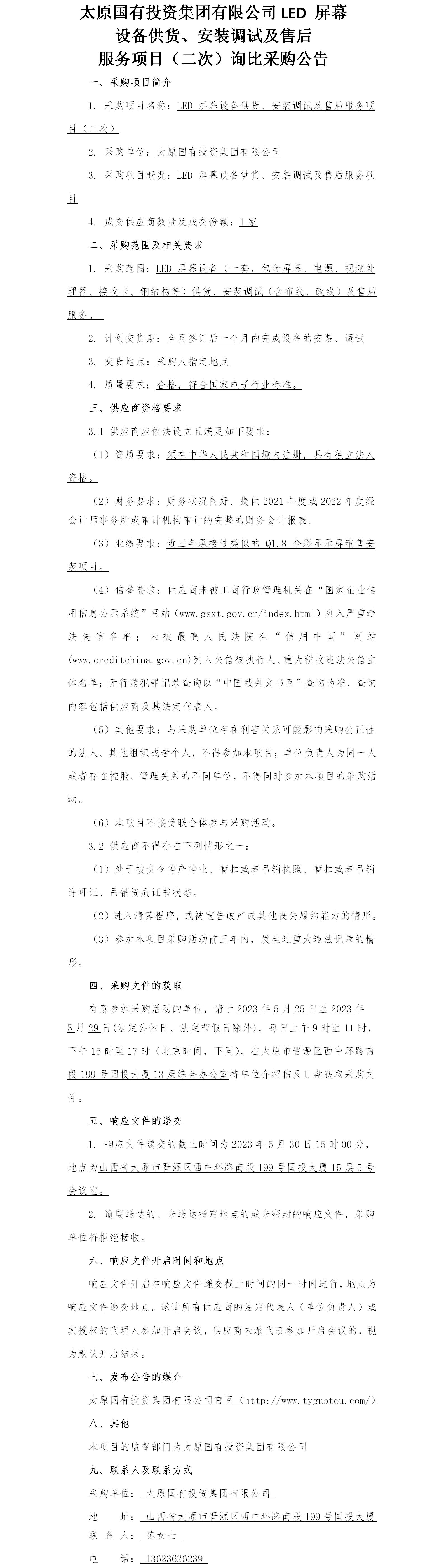 太原國有投資集團有限公司LED 屏幕設備供貨、安裝調(diào)試及售后服務項目(二次)詢比采購公示