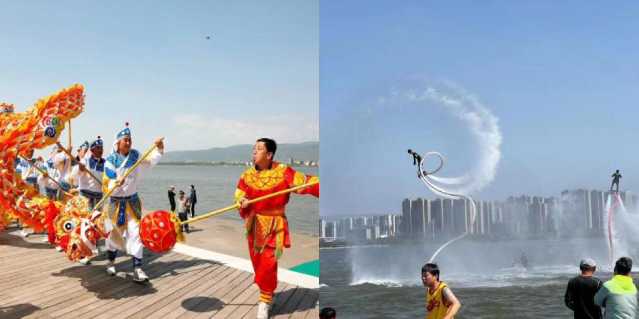 在碧波蕩漾的晉陽湖,鑼鼓喧天,群龍熱舞,水中飛起的空中飛人似蛟龍出海,一系列的活動吸引了無數(shù)游客前來觀賞,一同歡慶一年一度的中華民族傳統(tǒng)節(jié)日——端午節(jié)。