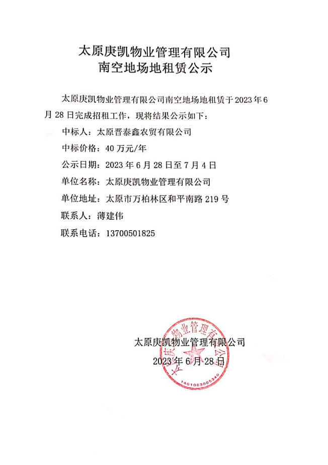 庚凱公司南空地項(xiàng)目場地租賃公示