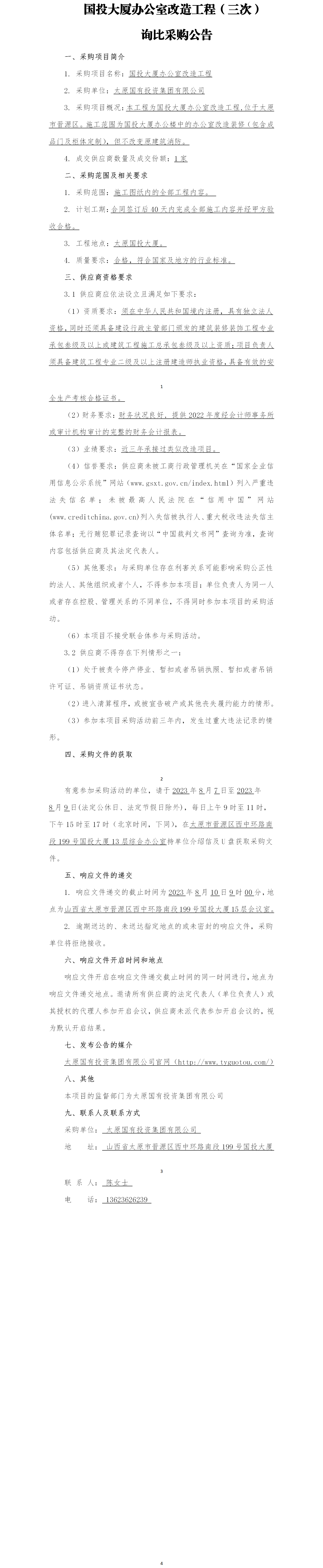 國投大廈辦公室改造工程(三次) 詢比采購公告