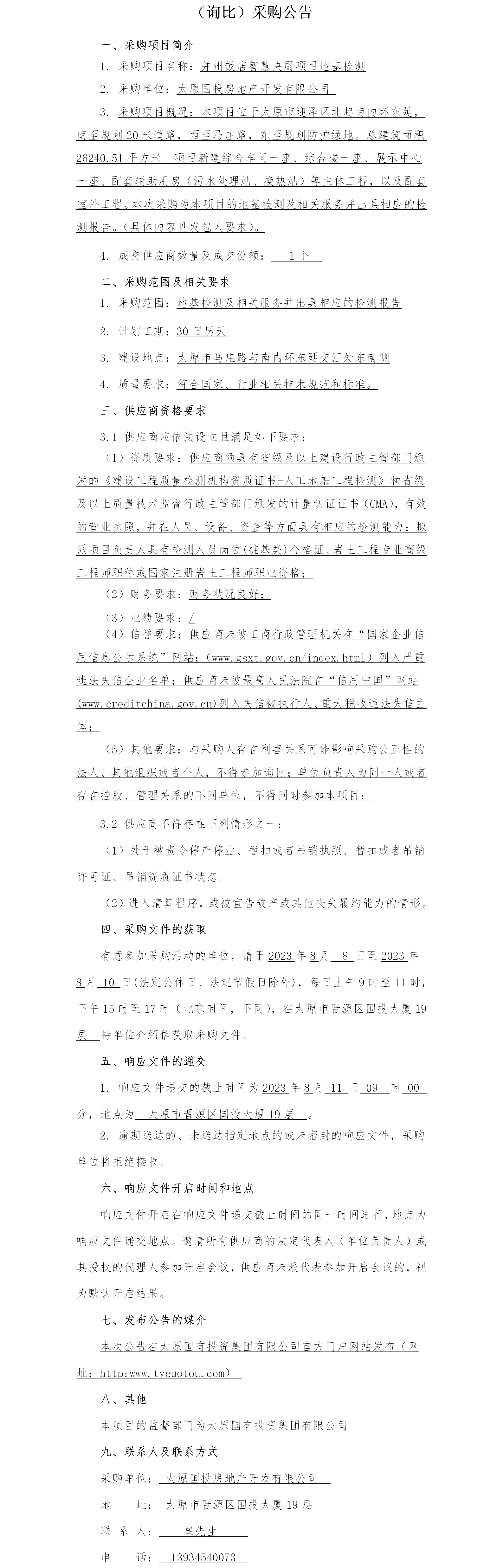 并州飯店智慧央廚項(xiàng)目地基檢測(詢比)采購公告
