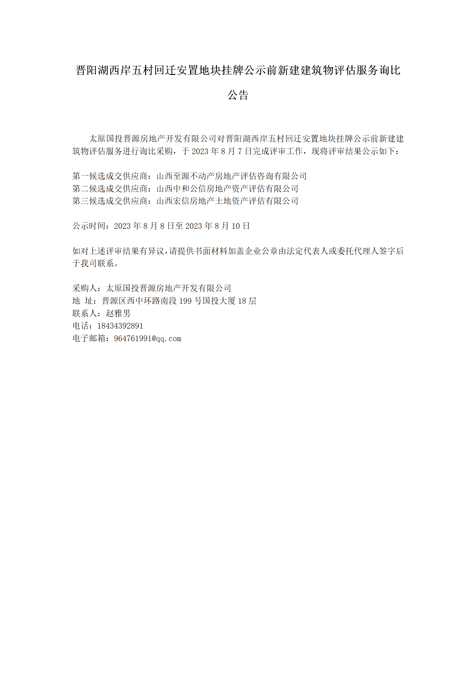 晉陽(yáng)湖西岸五村回遷安置地塊掛牌公示前新建建筑物評(píng)估服務(wù)詢比候選人公示