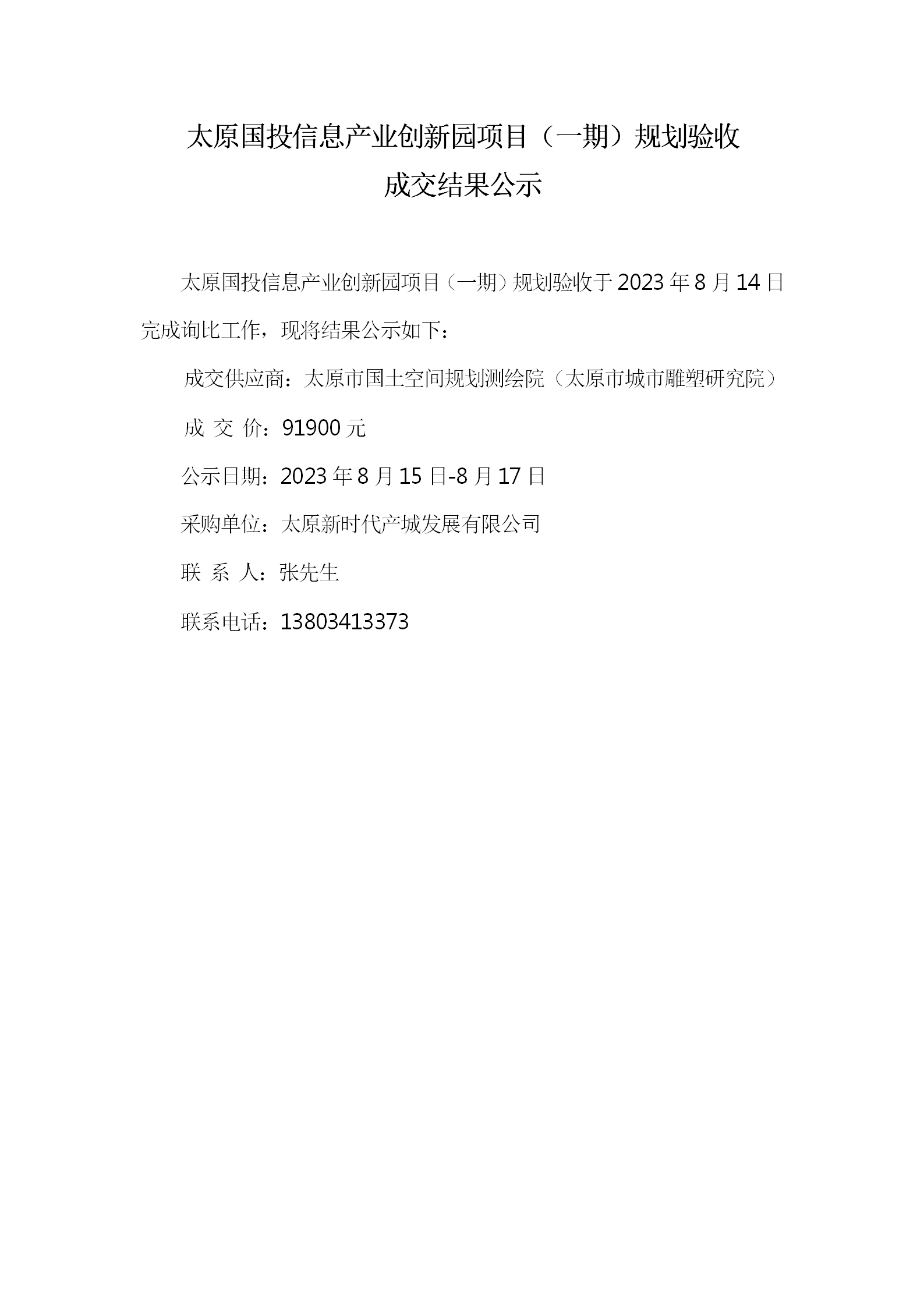 太原國投信息產(chǎn)業(yè)創(chuàng)新園項(xiàng)目(一期)規(guī)劃驗(yàn)收 成交結(jié)果公示