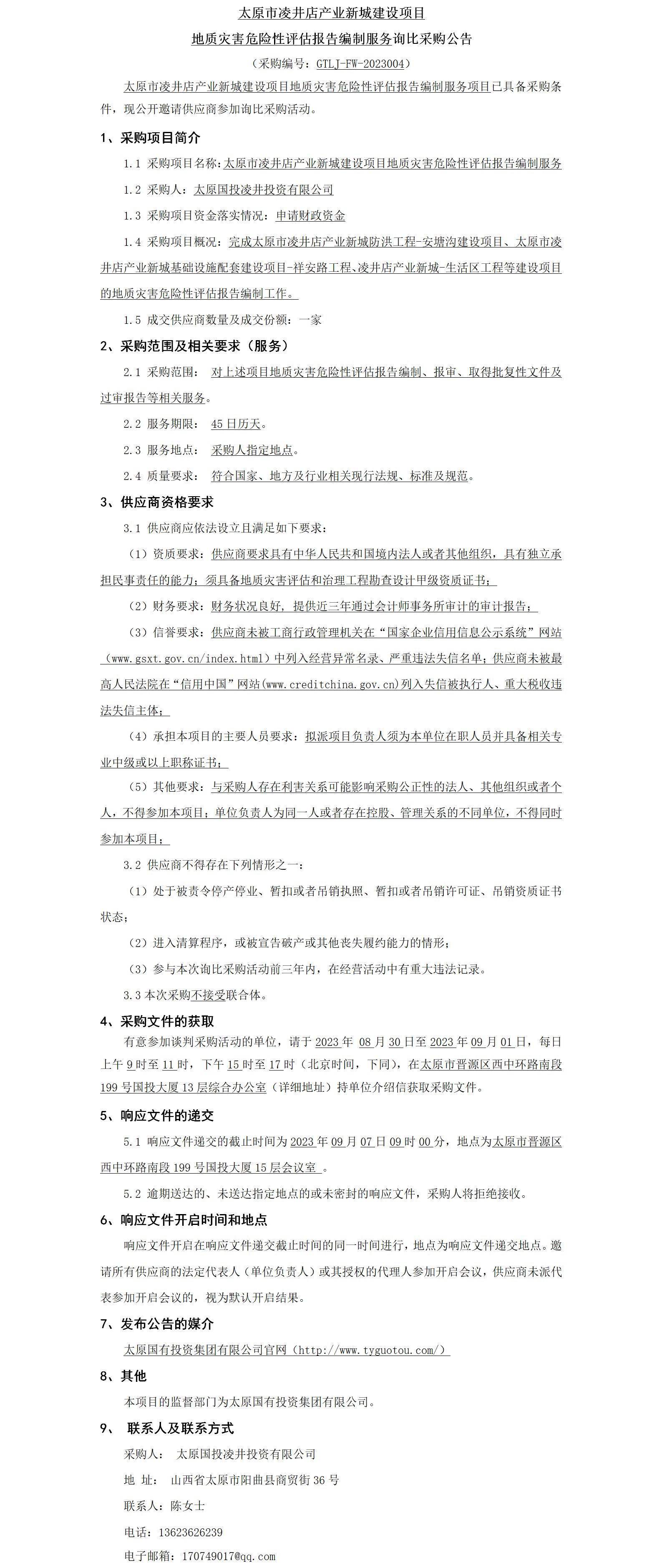 太原市凌井店產業(yè)新城建設項目地質災害危險性評估報告編制服務采購項目詢比采購公告