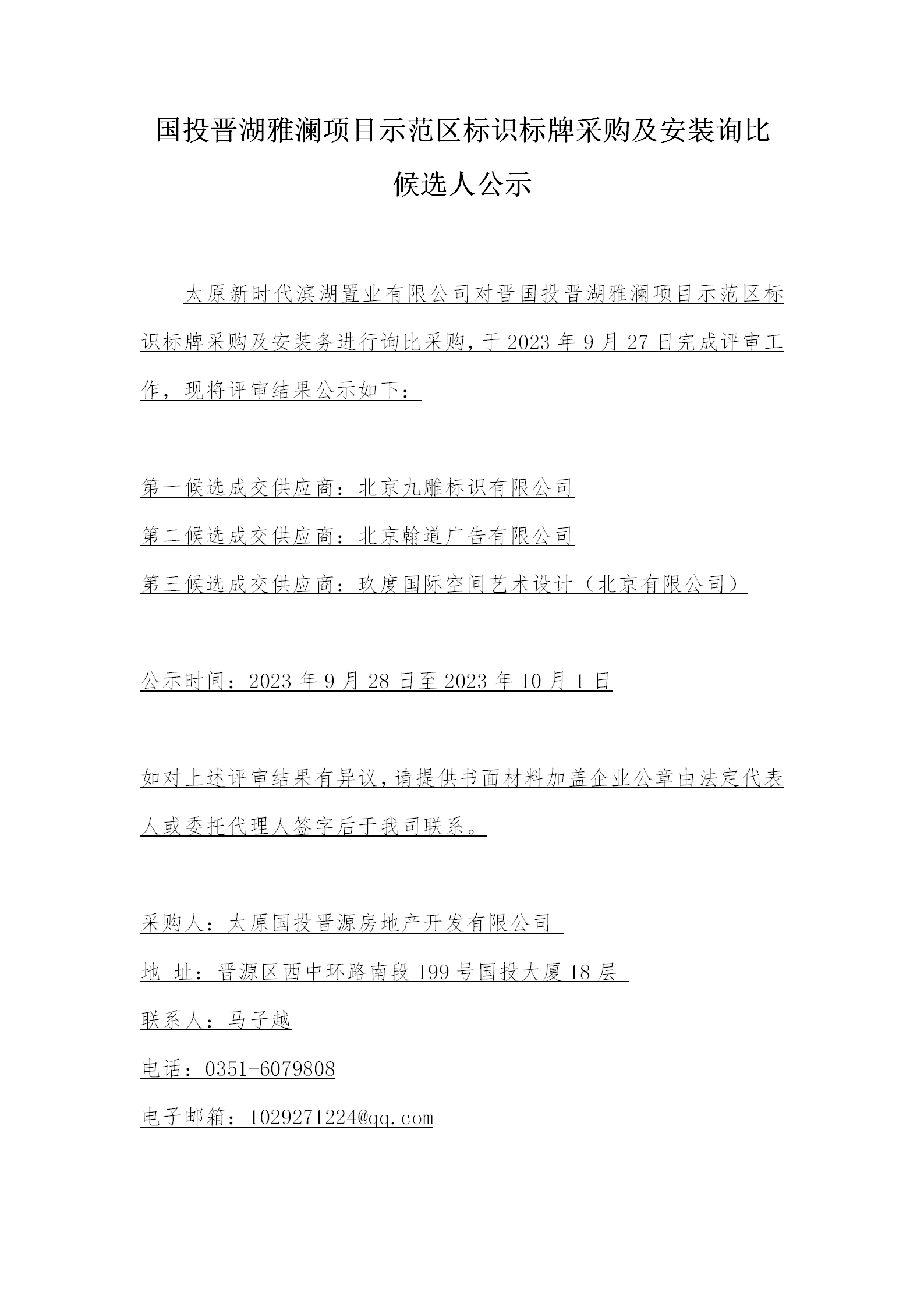 國投晉湖雅瀾項目示范區(qū)標識標牌采購及安裝詢比候選人公示
