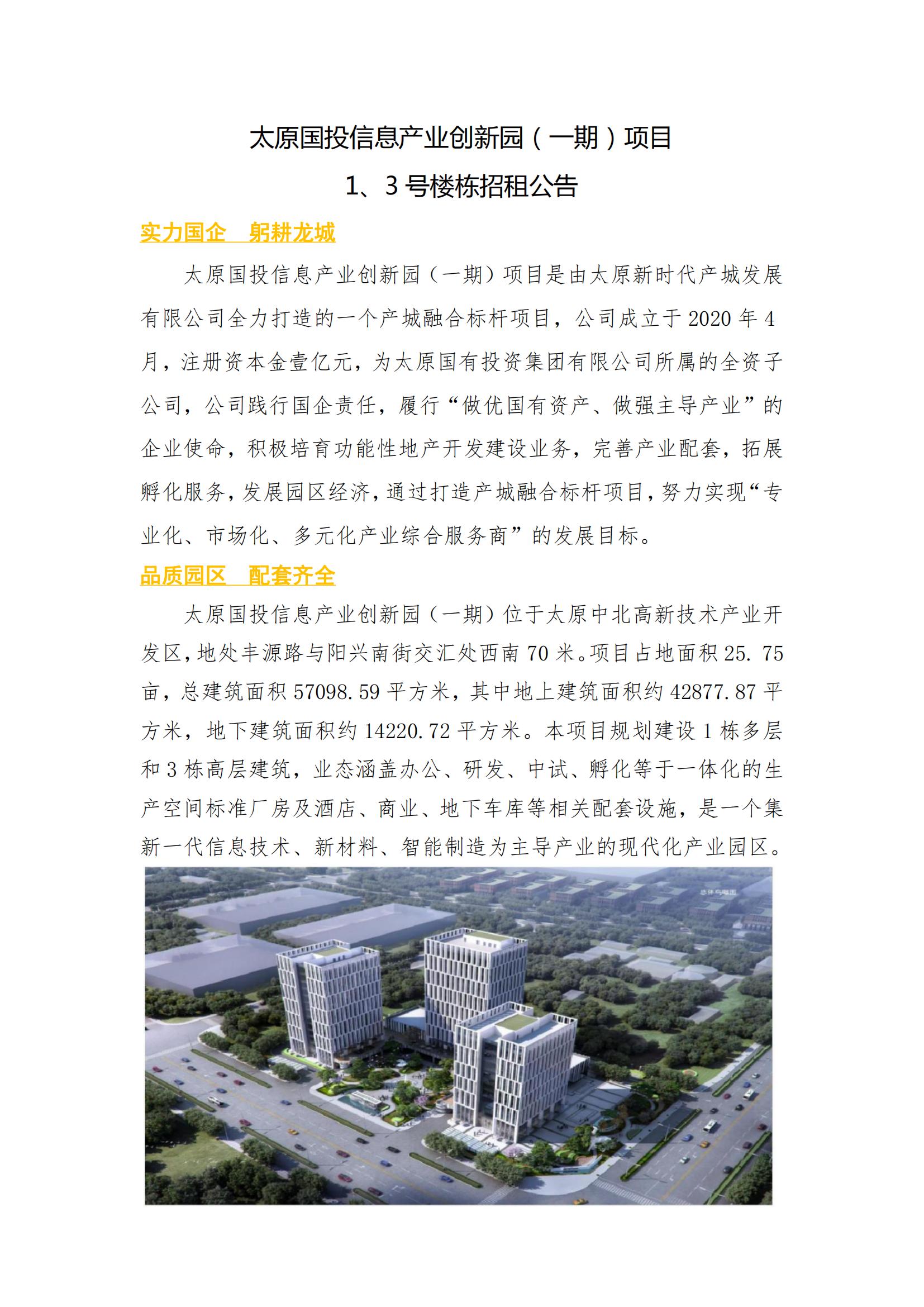 太原國投信息產業(yè)創(chuàng)新園(一期)項目1、3號樓棟招租公告