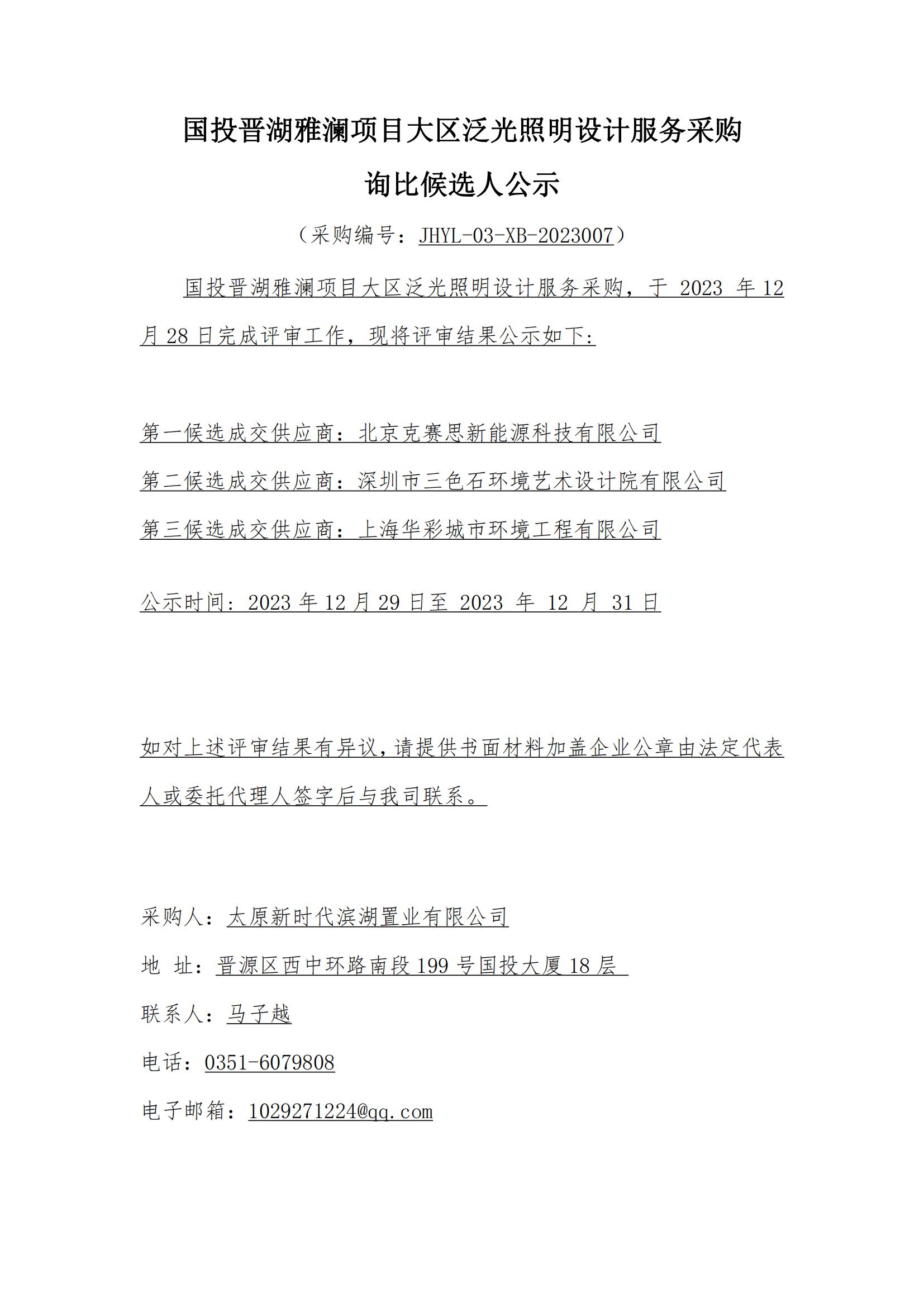 國投晉湖雅瀾項目大區(qū)泛光照明設(shè)計服務(wù)采購詢比候選人公示