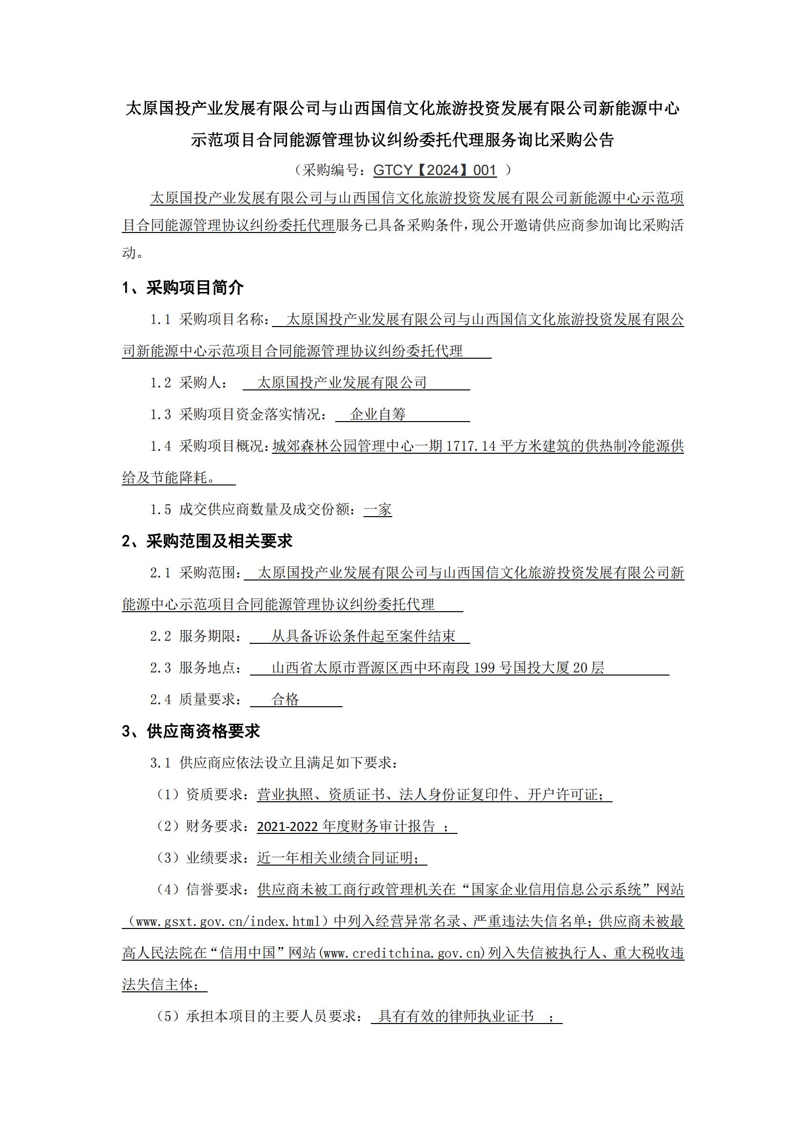 太原國投產(chǎn)業(yè)發(fā)展有限公司與山西國信文化旅游投資發(fā)展有限公司新能源中心示范項(xiàng)目合同能源管理協(xié)議糾紛委托代理服務(wù)詢比采購公告
