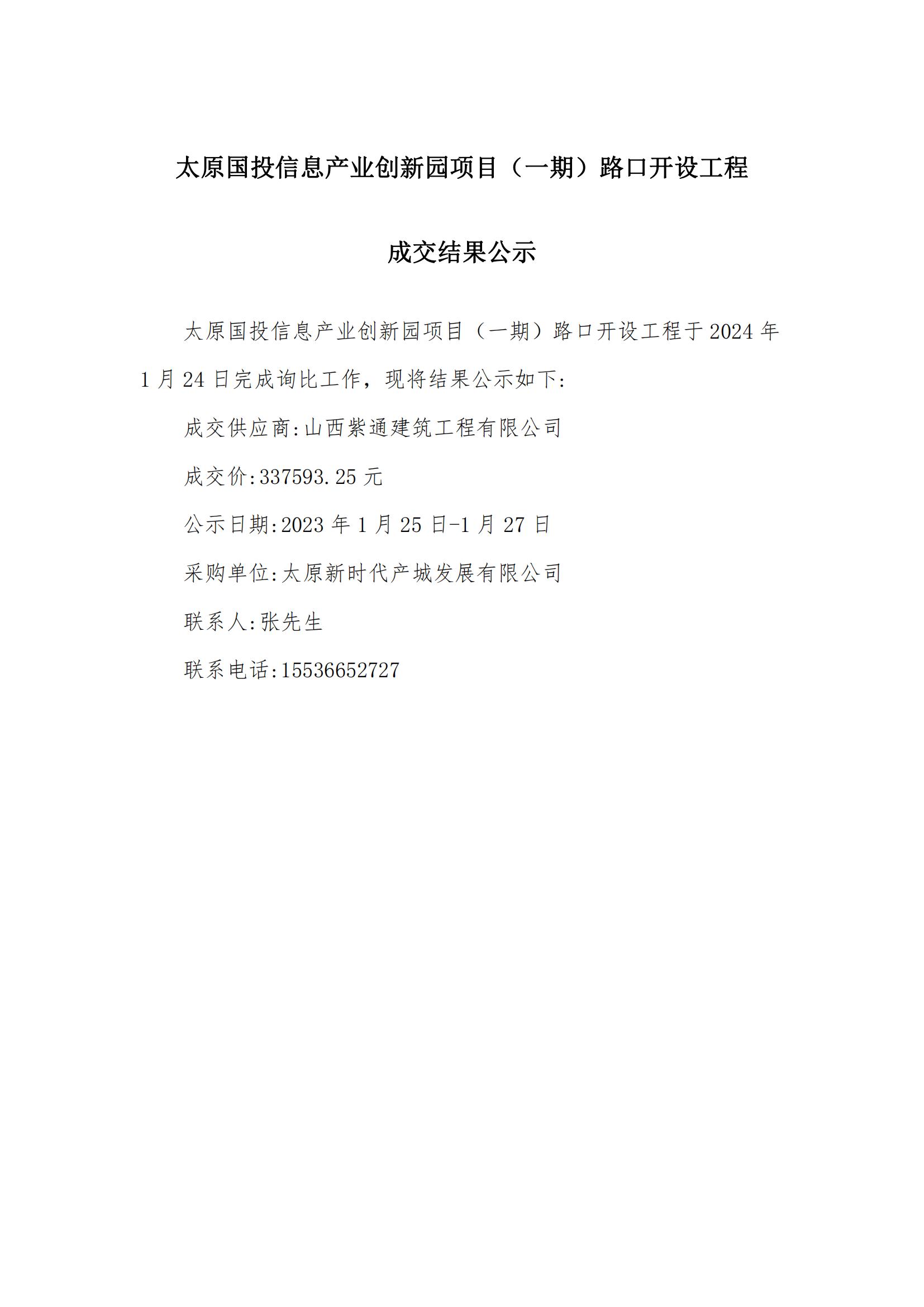 太原國(guó)投信息產(chǎn)業(yè)創(chuàng)新園項(xiàng)目(一期)路口開設(shè)工程成交結(jié)果公示