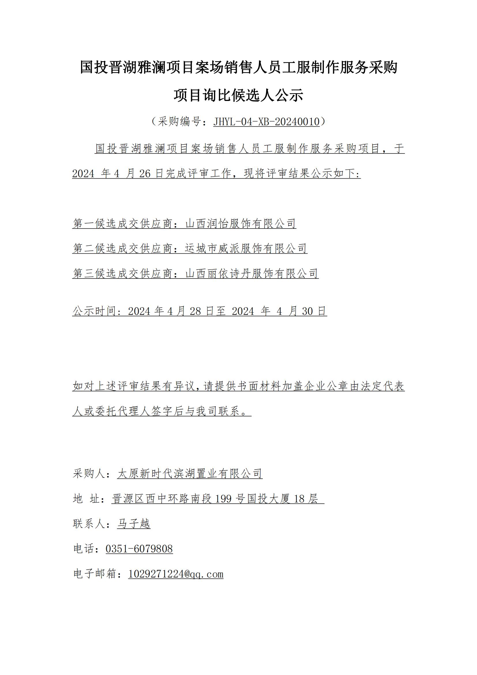 國(guó)投晉湖雅瀾項(xiàng)目案場(chǎng)銷售人員工服制作服務(wù)采購(gòu)項(xiàng)目詢比候選人公示