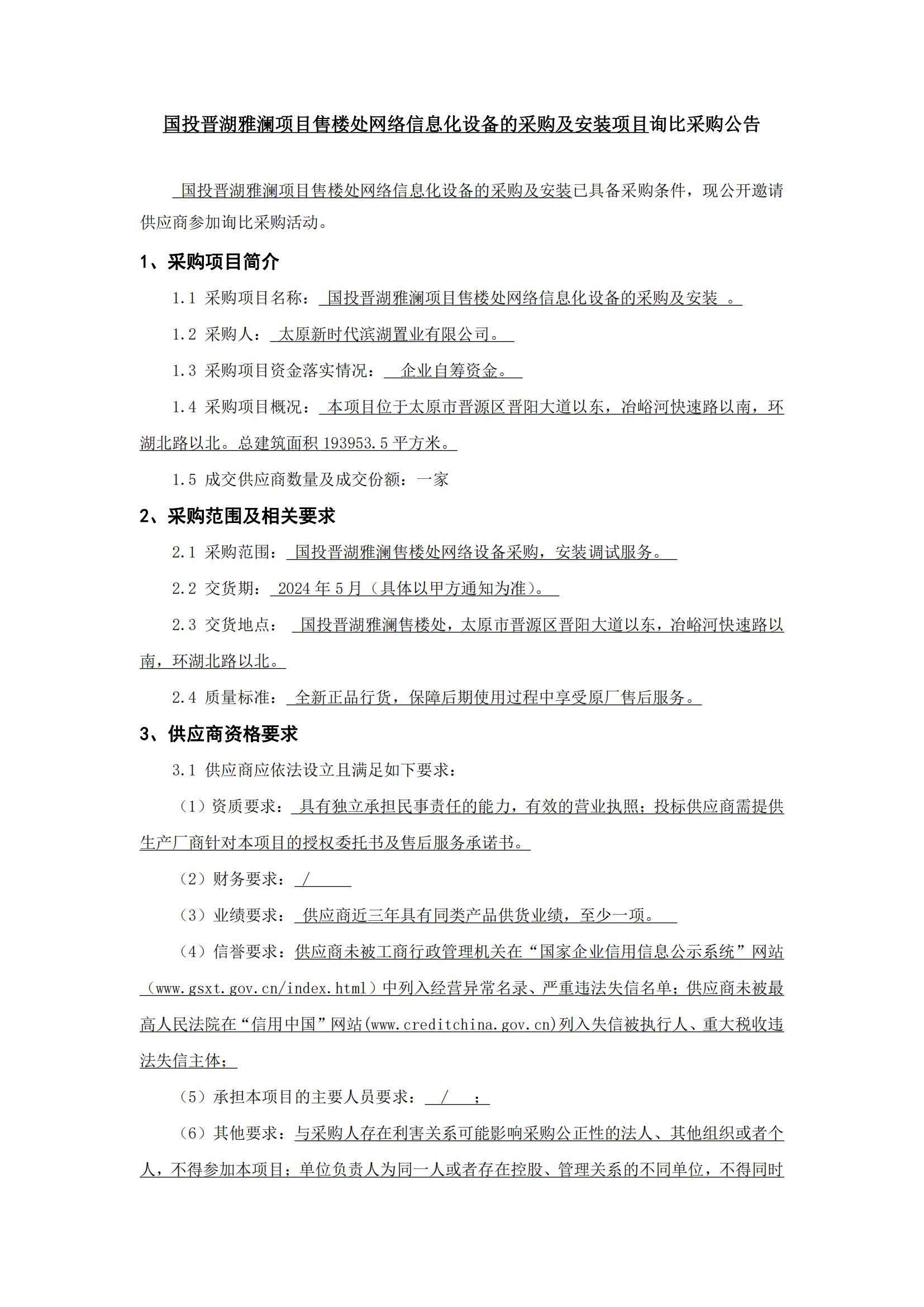 國投晉湖雅瀾項目售樓處網(wǎng)絡(luò)信息化設(shè)備的采購及安裝項目詢比采購公告