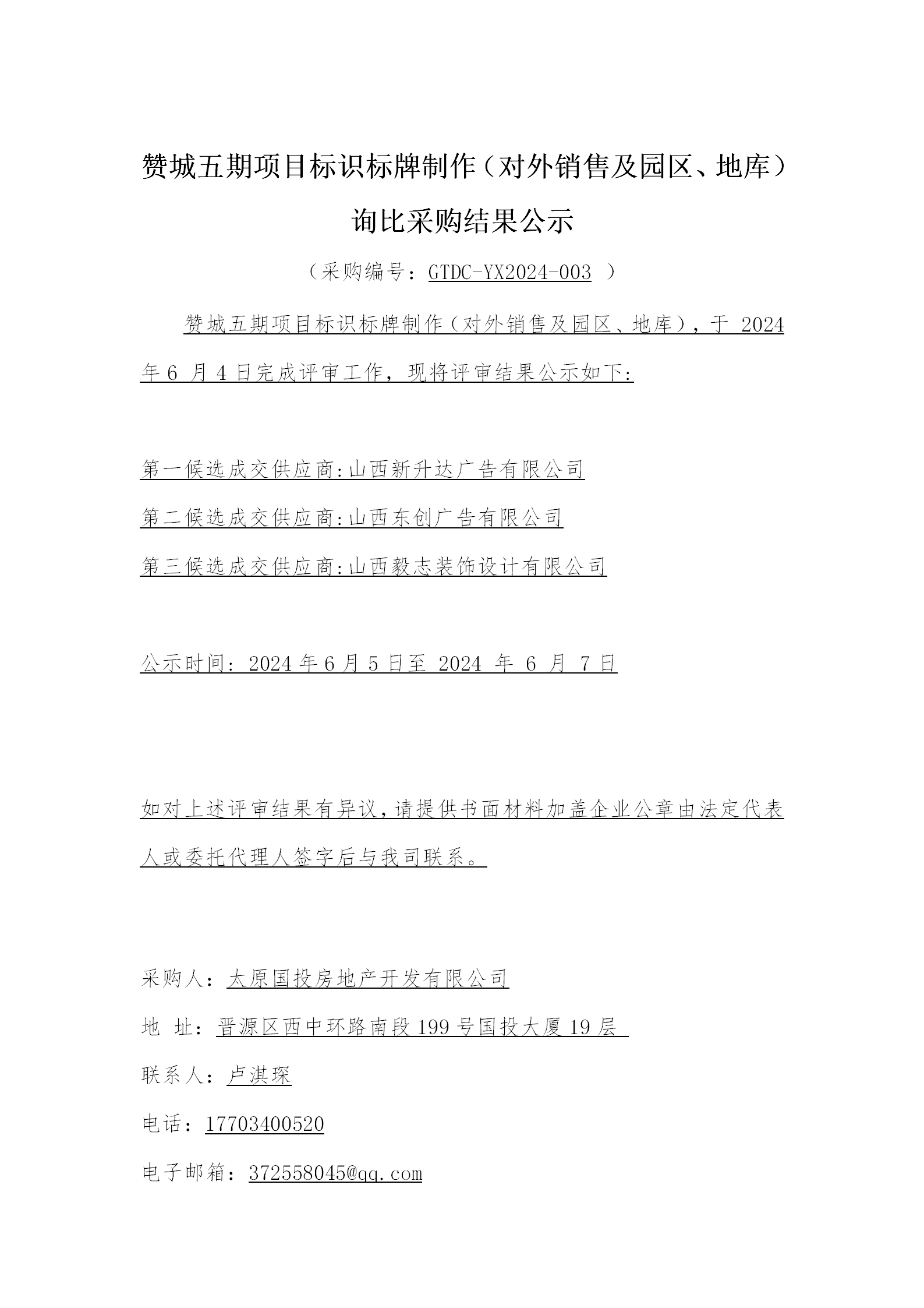贊城五期項目標識標牌制作(對外銷售及園區(qū)、地庫)詢比采購結(jié)果公示