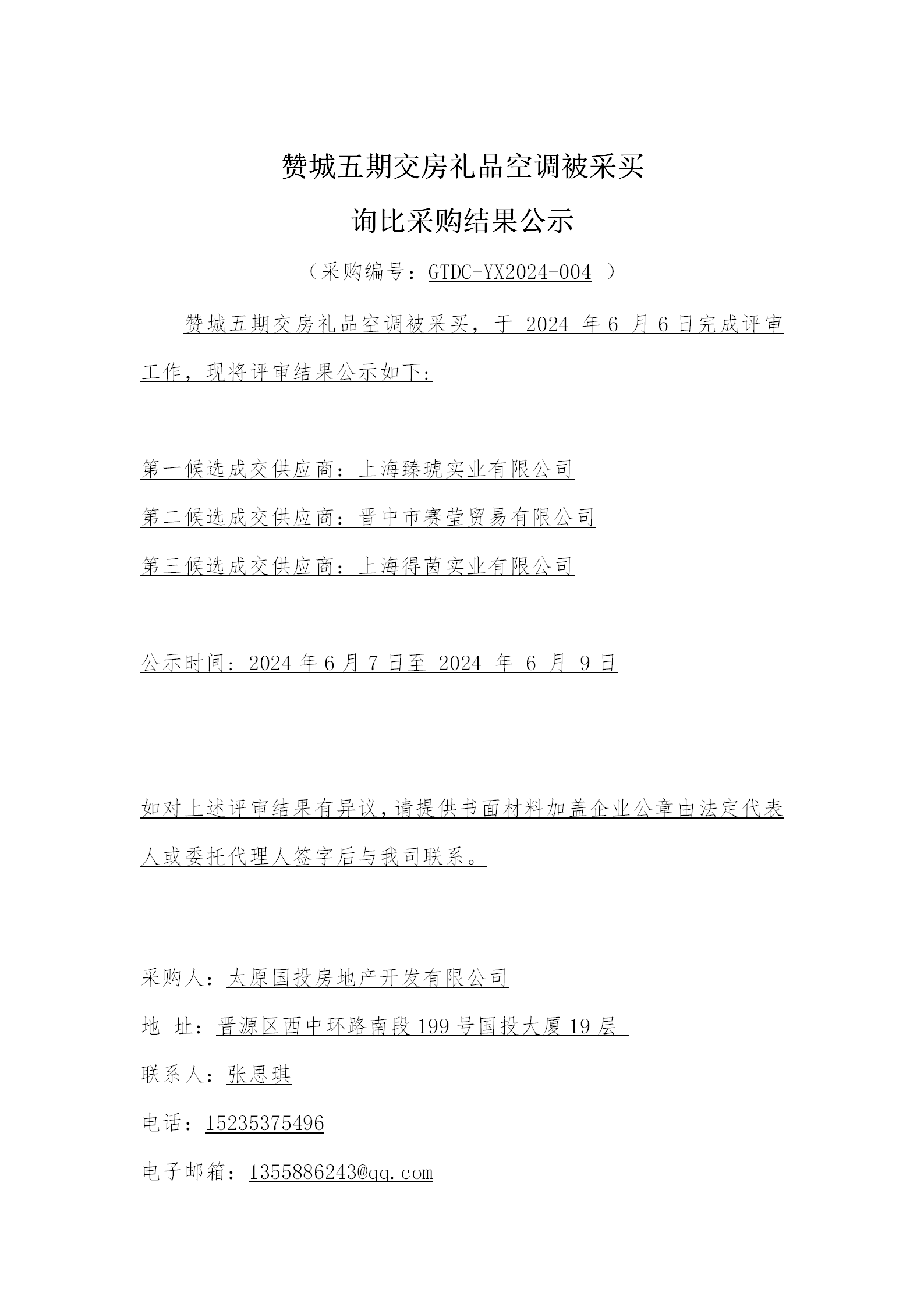 贊城五期交房禮品空調(diào)被采買詢比采購結果公示
