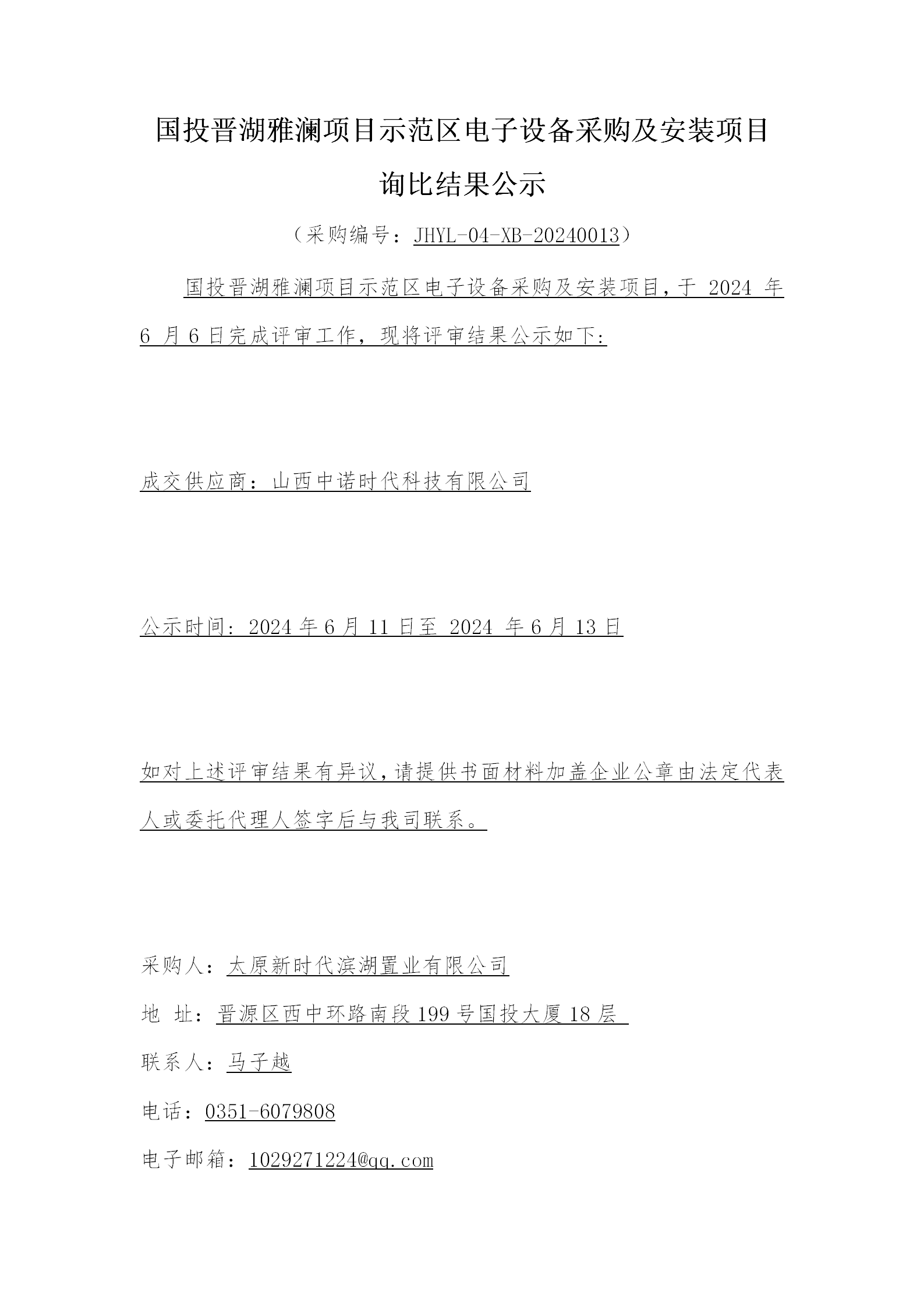 國(guó)投晉湖雅瀾項(xiàng)目示范區(qū)電子設(shè)備采購(gòu)及安裝項(xiàng)目詢比結(jié)果公示