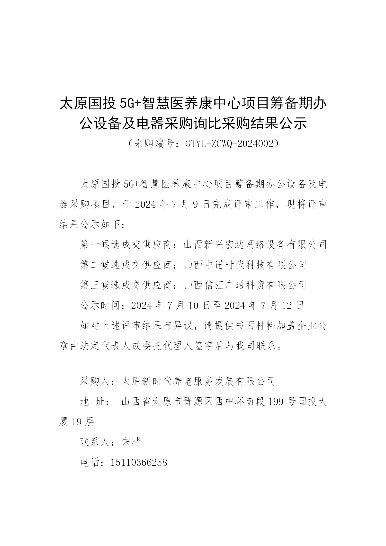太原國投5G+智慧醫(yī)養(yǎng)康中心項目籌備期辦公設(shè)備及電器采購詢比采購結(jié)果公示