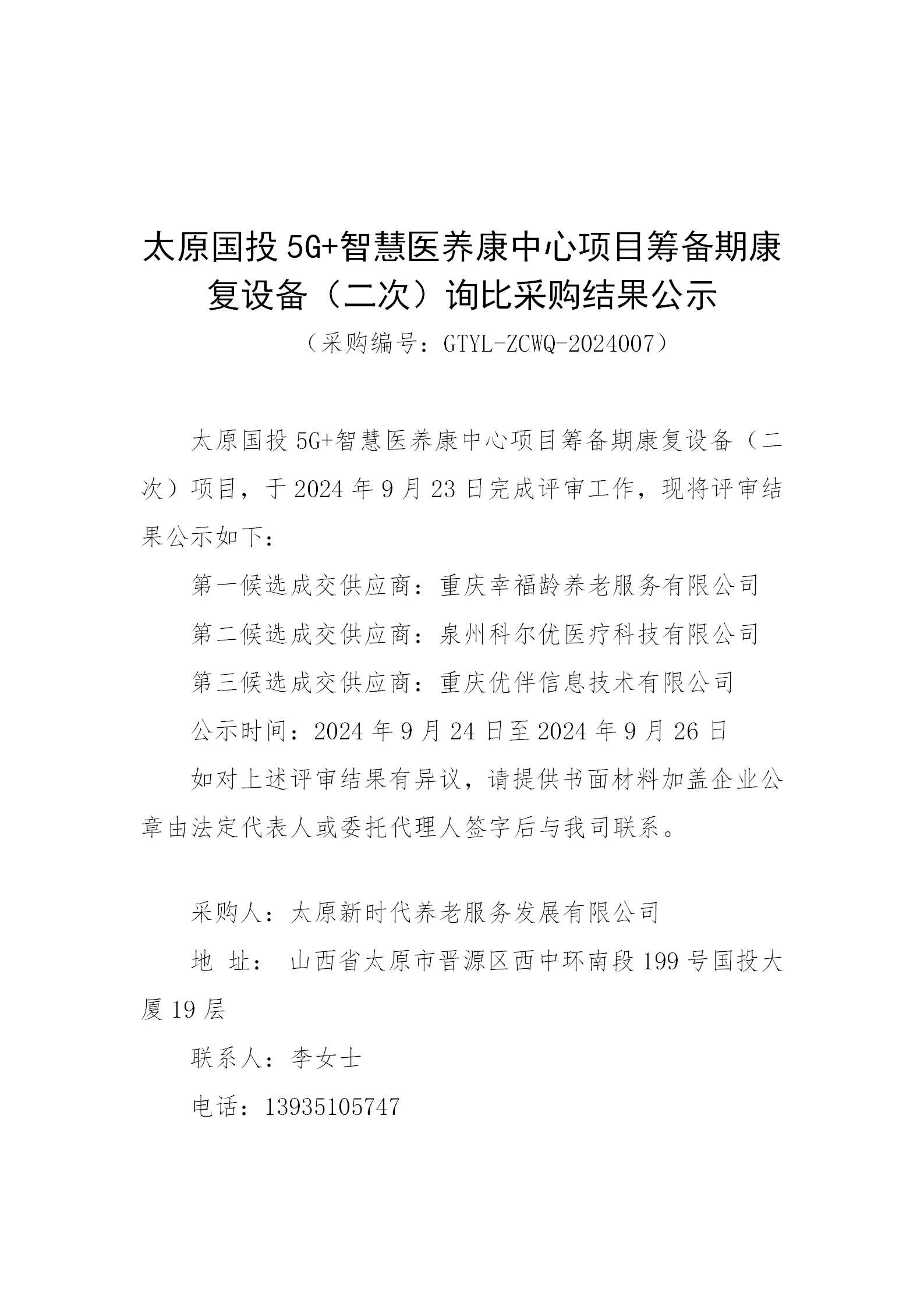 太原國(guó)投5G+智慧醫(yī)養(yǎng)康中心項(xiàng)目籌備期康復(fù)設(shè)備(二次)詢比采購(gòu)結(jié)果公示