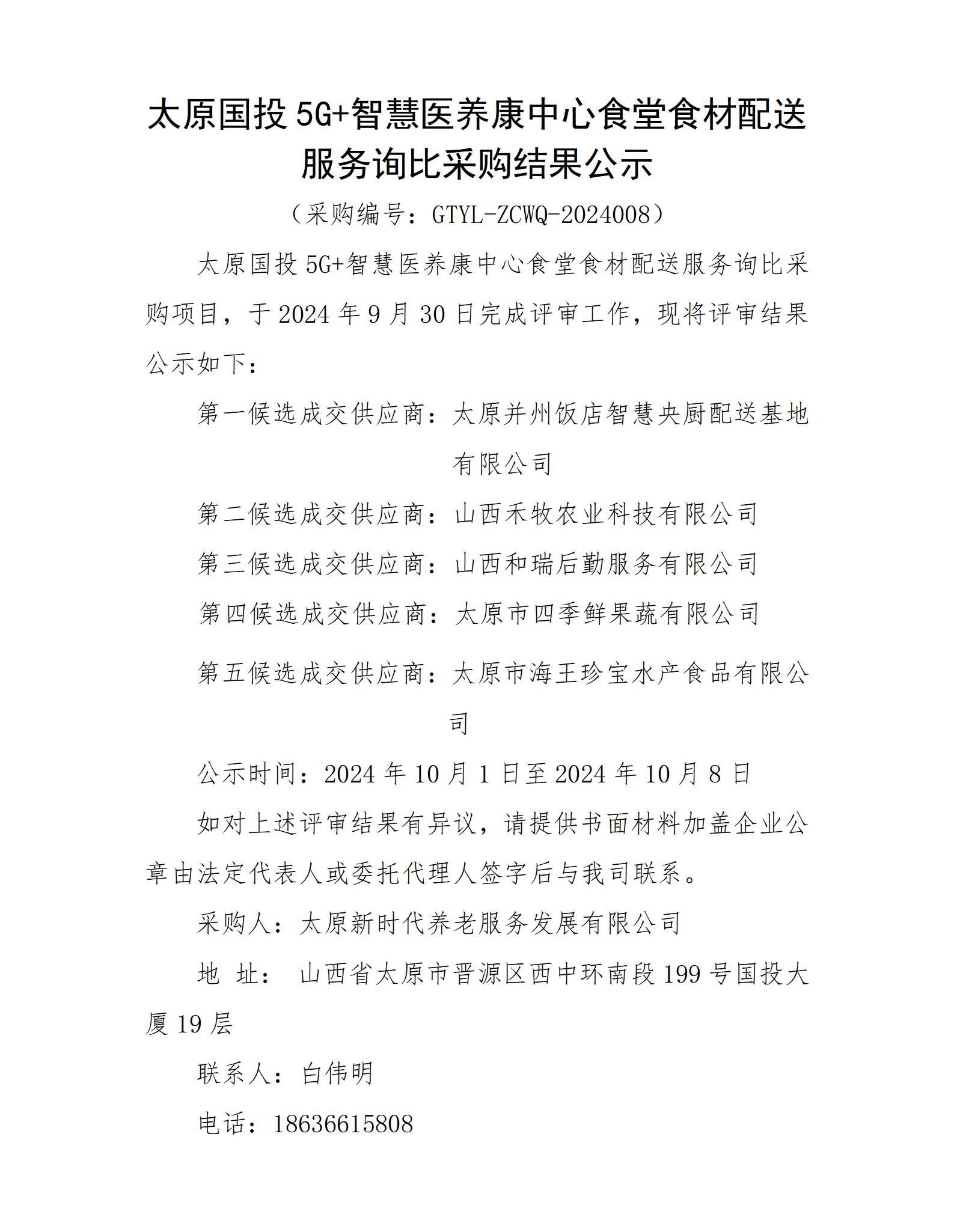 太原國投5G+智慧醫(yī)養(yǎng)康中心食堂食材配送服務(wù)詢比采購結(jié)果公示