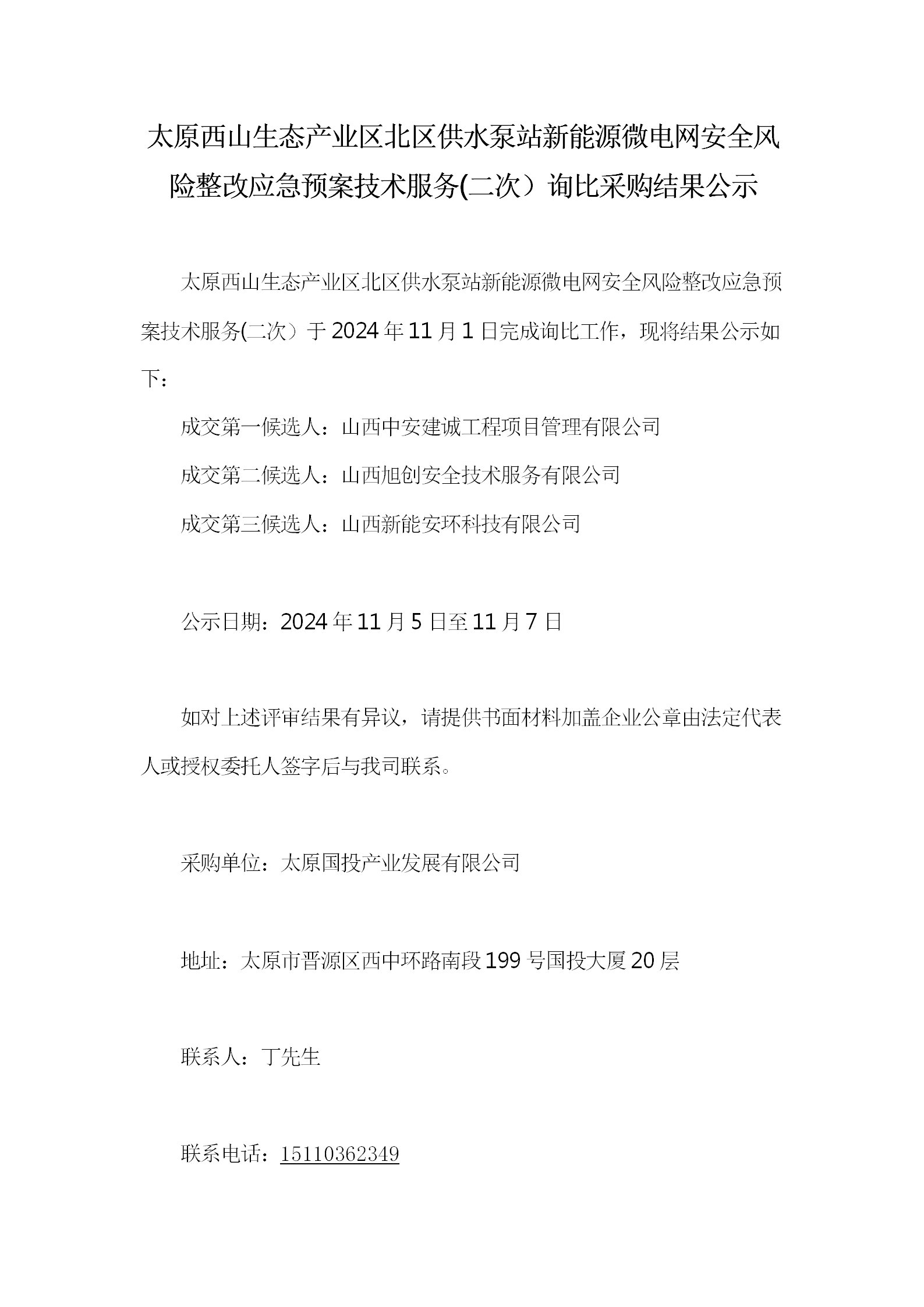 太原西山生態(tài)產(chǎn)業(yè)區(qū)北區(qū)供水泵站新能源微電網(wǎng)安全風(fēng)險(xiǎn)整改應(yīng)急預(yù)案技術(shù)服務(wù)(二次)詢比采購(gòu)結(jié)果公示