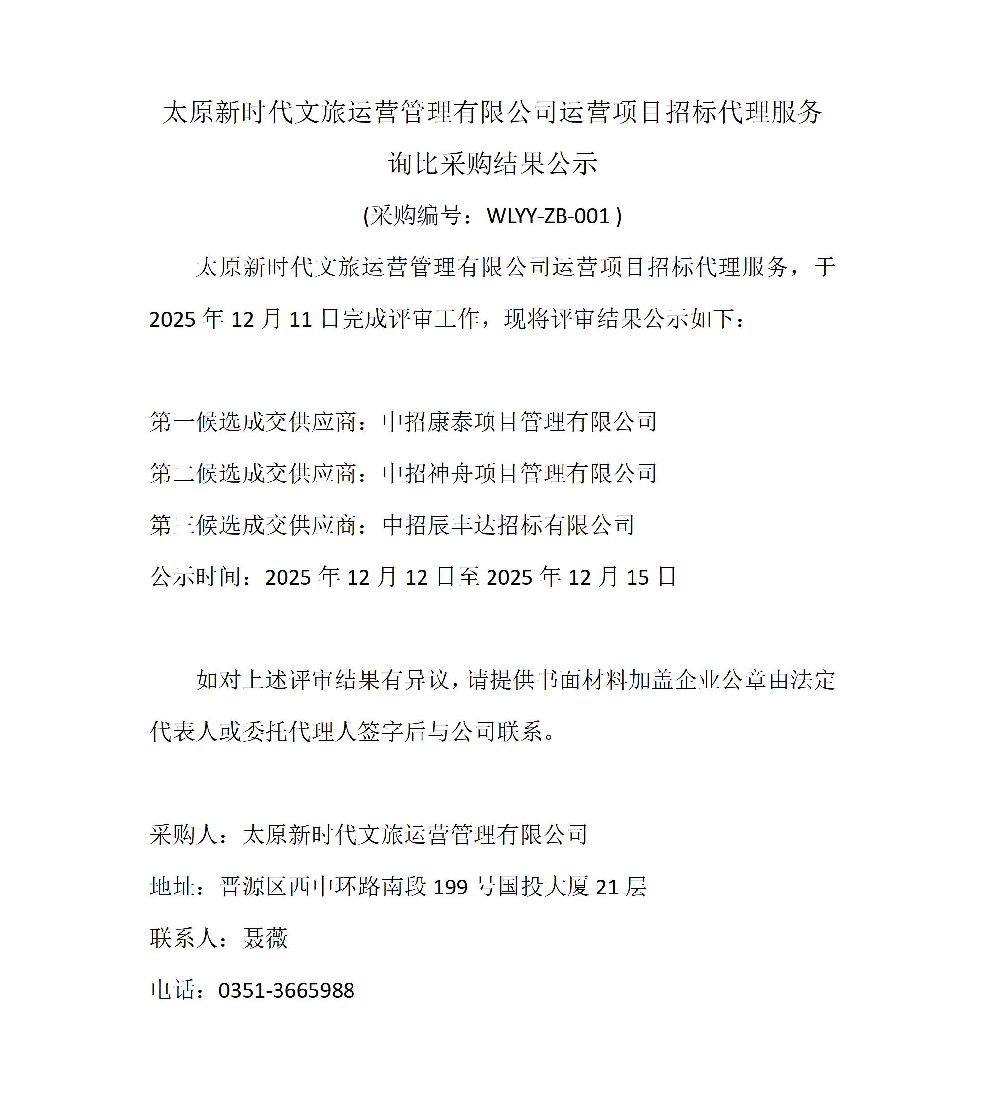 太原新時(shí)代文旅運(yùn)營管理有限公司運(yùn)營項(xiàng)目招標(biāo)代理服務(wù)采購項(xiàng)目詢比采購結(jié)果公示