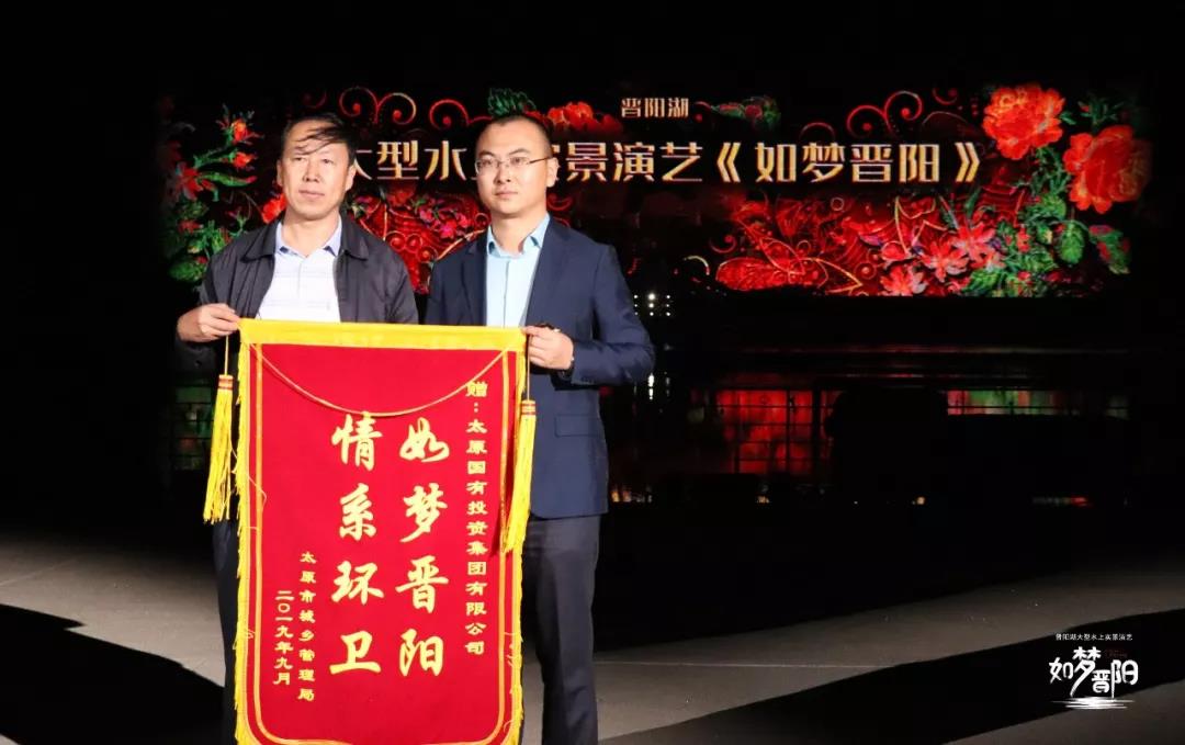 隨后,太原市城鄉(xiāng)管理局副局長時中瑛為太原國投商業(yè)運(yùn)營管理有限公司總經(jīng)理張耀偉、北京金藝世紀(jì)文化傳媒有限公司山西分公司副總經(jīng)理徐婧贈送了“如夢晉陽·情系環(huán)衛(wèi)”的錦旗。